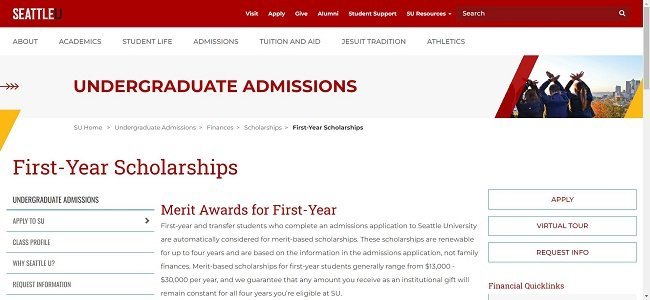 The merit awards for first-year international students was launched by Seattle University to provide scholarship opportunities to the students who have completed their first admission into the University. These students will automatically be considered for merit-based scholarships. Under this scholarship, the selected candidates will be rewarded with $13,000 to $30,000 per year as an institutional gift to continue their education. All the students who meet the eligibility criteria can easily apply under this scholarship by visiting the official website before the last date. The application forms are easily available on the official website of the university.